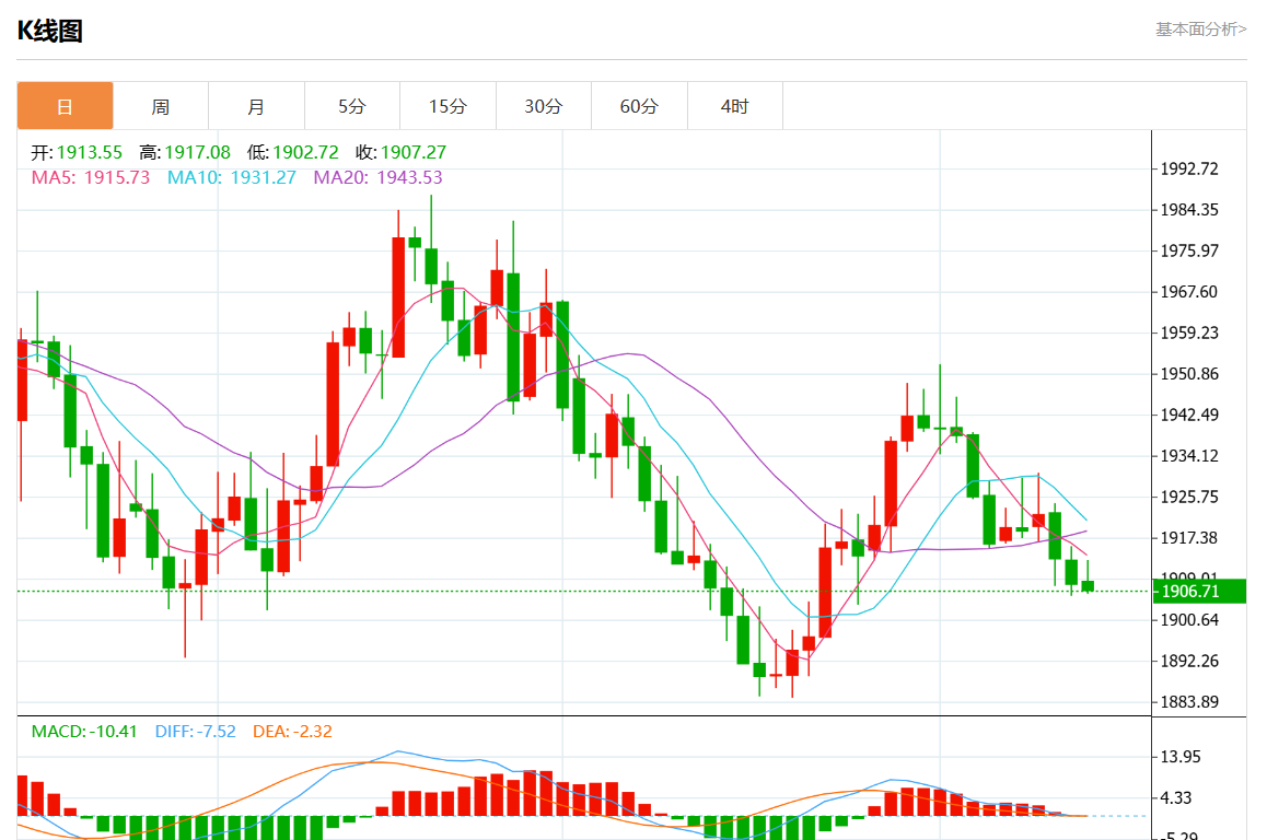 周四欧市盘中,现货黄金报1905.95,跌幅0.11%。