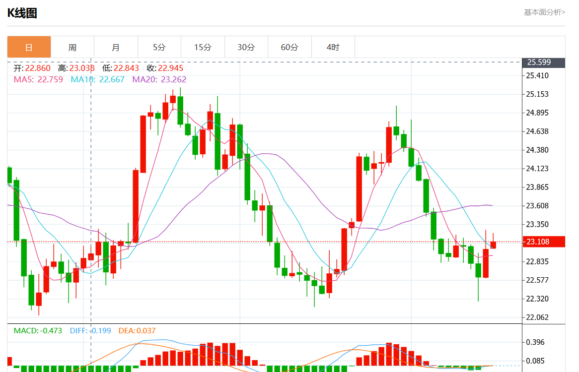周一欧市盘中,现货白银报23.100,涨幅0.39%。
