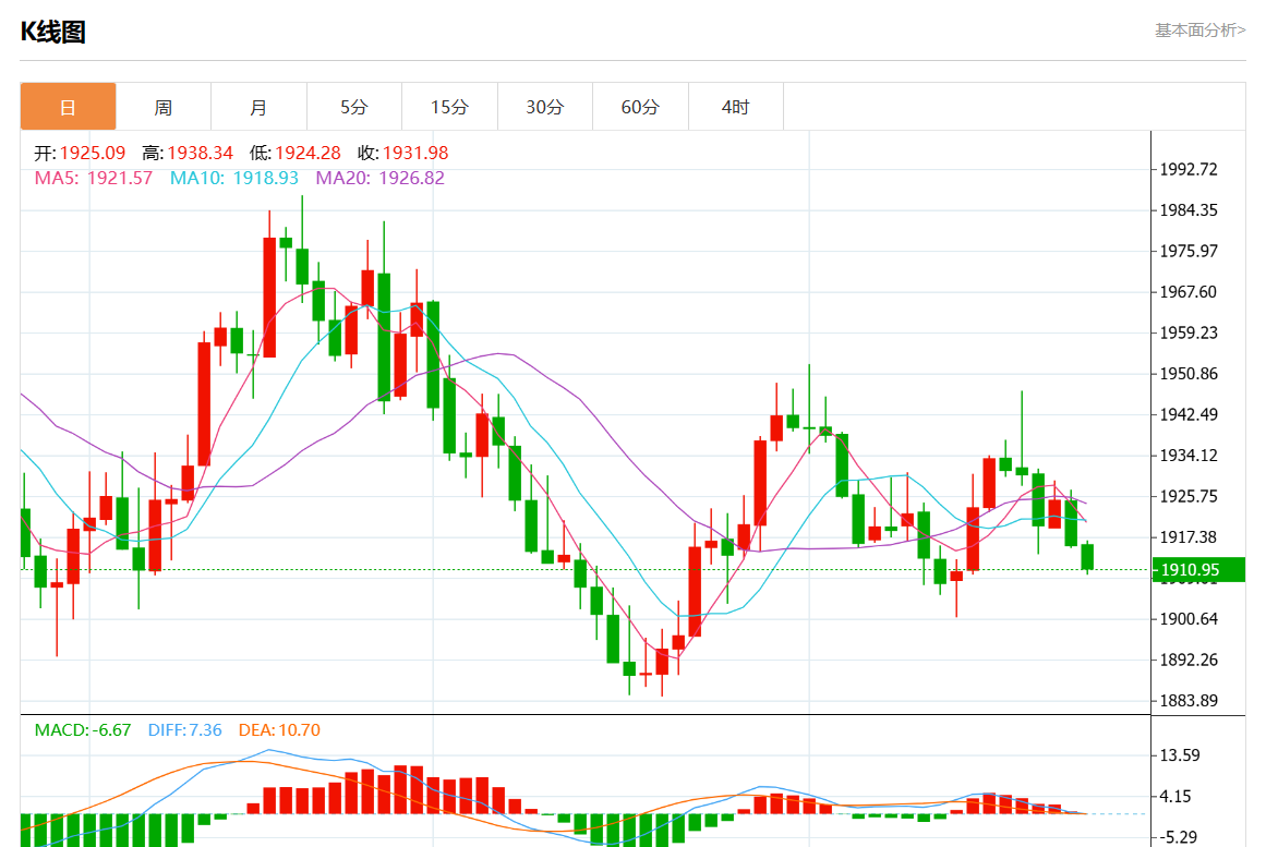 周二欧市盘中,现货黄金报1963.18,跌幅0.10%。