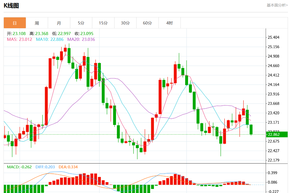 周二欧市盘中,现货白银报23.013,跌幅0.42%。