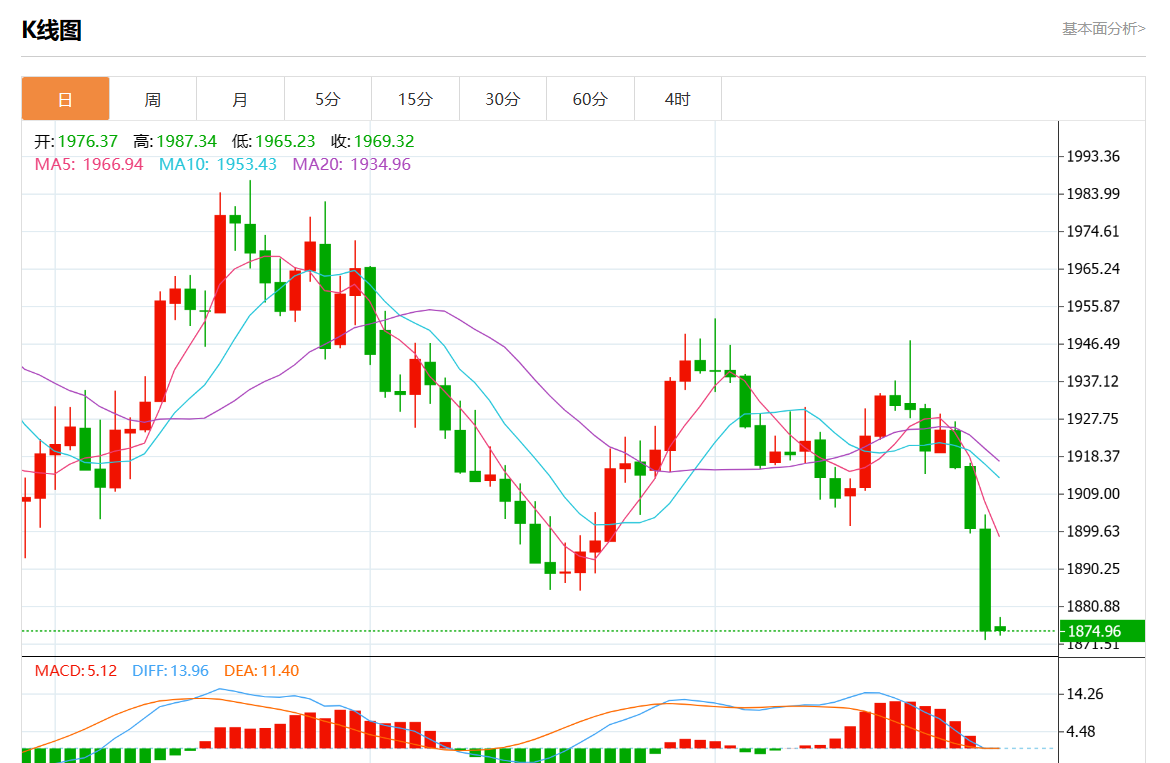周四欧市盘中,现货黄金报1874.62,跌幅0.01%。