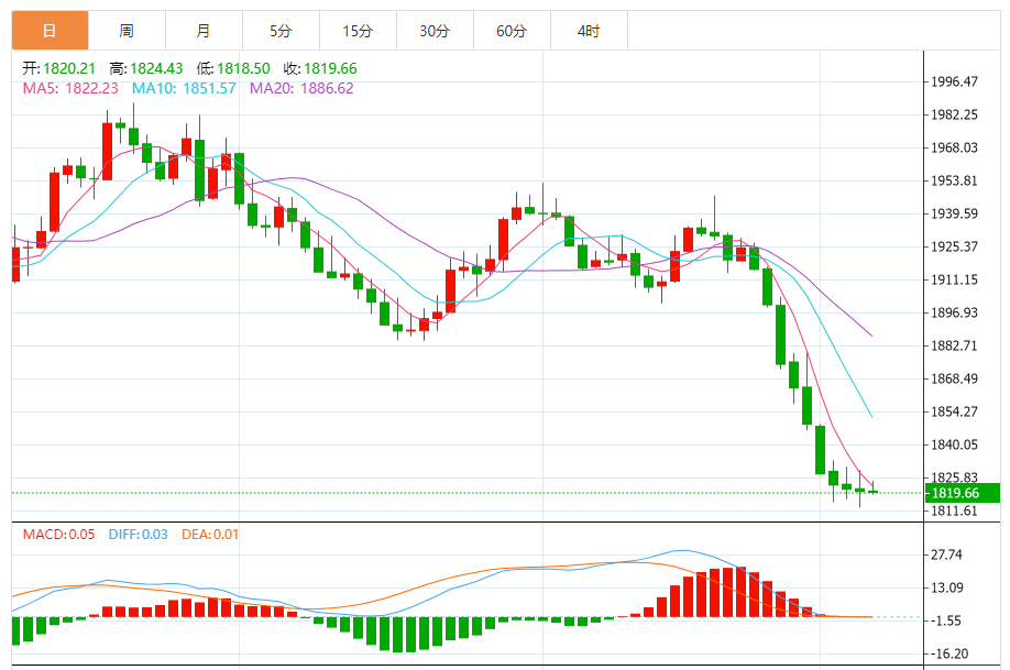 1)金技术面分析:黄金期货仍远低于1850美元/盎司阻力位。只要保持在1850美元/盎司以下,那么观点仍为看空,期金料测试1800美元/盎司,然后走势可能发生逆转。