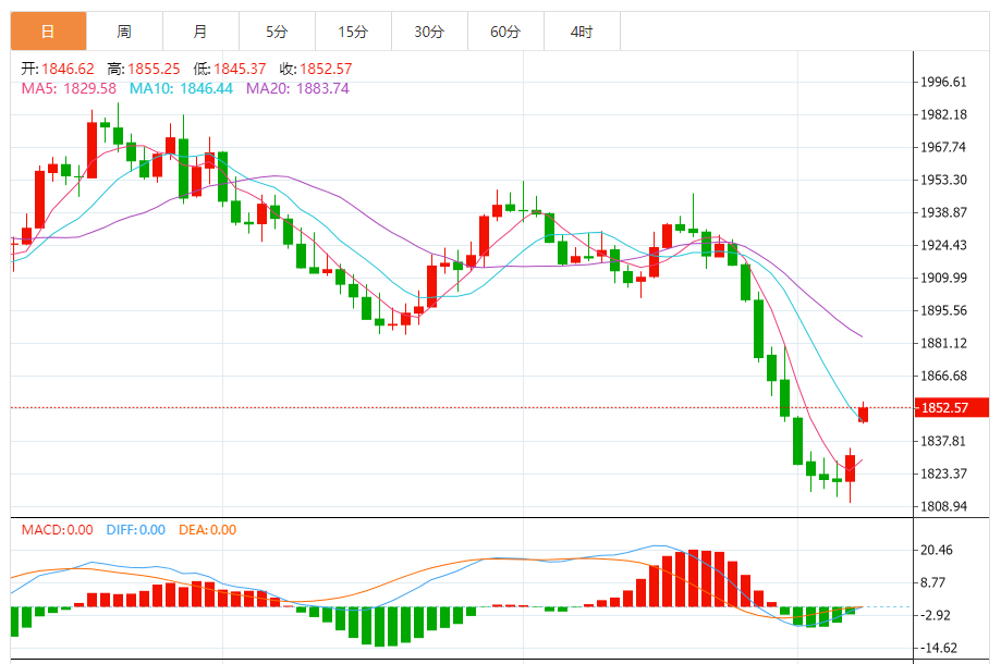 1)金技术面分析:黄金期货已从上周五测试的低点1823.50美元/盎司反弹至1850美元/盎司上方。只要这一反弹走势持续,那么期金可能涨向1900美元/盎司。