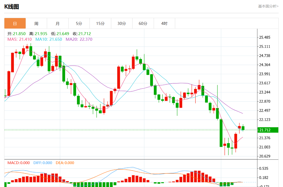 周二欧市盘中,现货白银报21.762,跌幅0.45%。