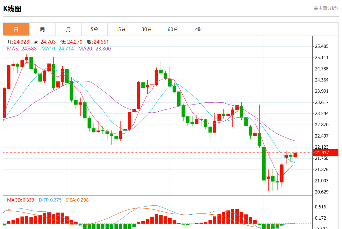 周三欧市盘中,现货白银报22.075,涨幅1.15%。