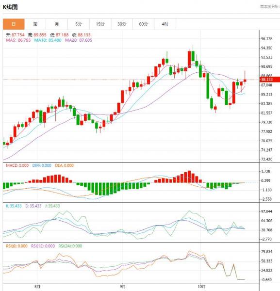 星期三(十月十八日),原油价格交投于88.50美元/桶附近。有分析人士认为,油价当前来回变化,能源交易商正在关注美国的外交努力能不能成功阻止以色列-哈马斯冲突升级为更广泛的地区战争。