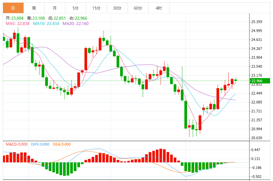 2)银技术面分析:白银期货已回升至23美元/盎司上方,此前提到的支撑位22.75美元/盎司一直保持良好。观点仍为看涨,白银期货料涨向24美元/盎司。