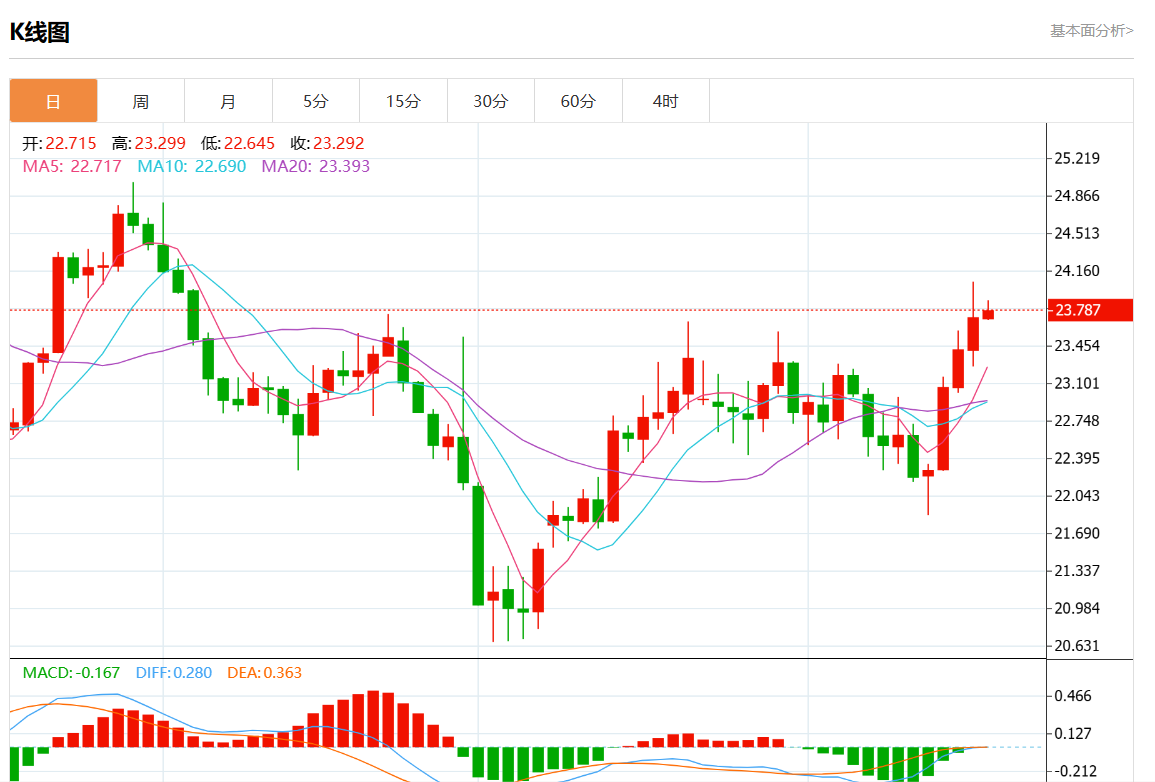 周五欧市盘中,现货白银报23.742,涨幅0.09%。