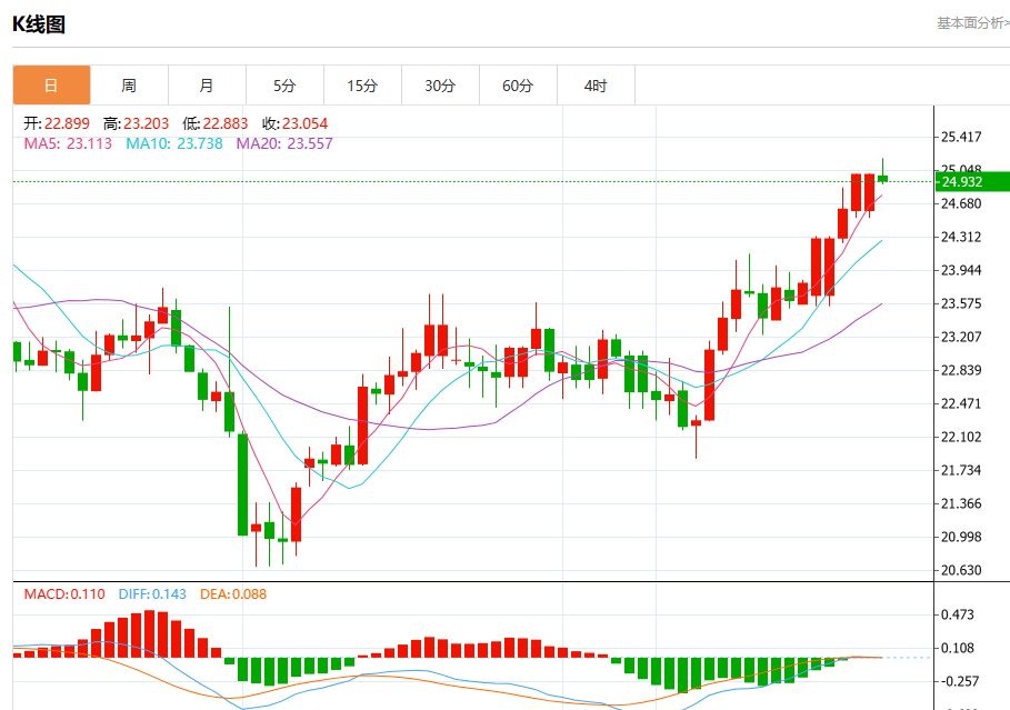 周三欧市盘中,现货白银报24.910,跌幅0.44%。