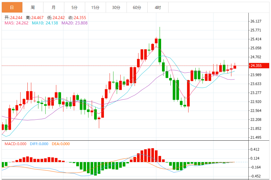 2)银技术面分析:白银期货在25.00-24.00美元/盎司区间内上升。若决定性地突破25美元/盎司,这可能为白银期货升向25.30-25.50美元/盎司铺平道路。