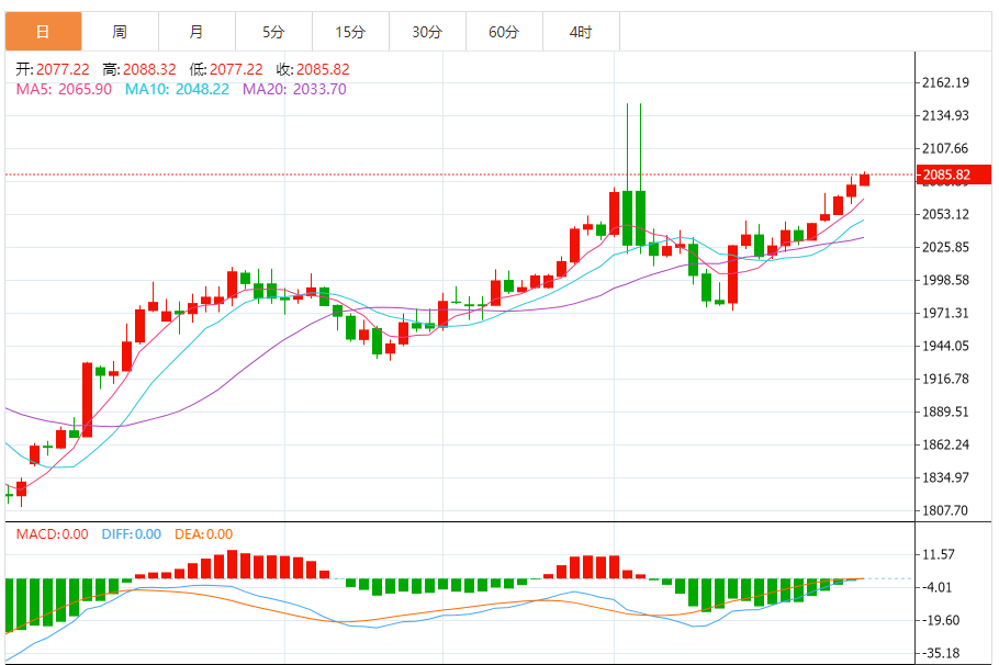 周四(12月28日),黄金期货维持日内反弹走势,期金目前位于2086美元/盎司附近。一旦攻克关键阻力2100美元/盎司,这将为期金进一步大涨打开空间。