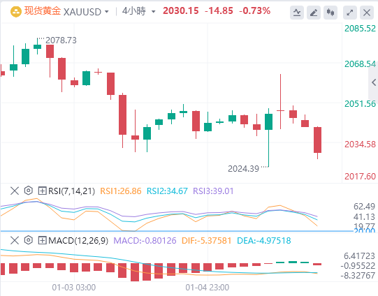 从黄金4小时图来看,金价自前期高点2088.2附近下跌以来,相继下破两条均线MA20和MA60,最低跌至2030.4附近,随后价格在2030.4-2050.7附近区间震荡,非农数据公布后,价格最低跌2024.3附近,随后反弹,最高上行至2063.7附近,遇阻回落,周五报收2045.5附近。连接前期高点2088.2附近和2078.7附近,作一条下行趋势线,可见下行趋势线与前高2063.7附近对价格具有共同压制作用。下方顺势指标CCI在超买区间附近拐头向下,显示价格反弹力度减弱,随时可能继续下跌。故日内如有反弹,当以逢高布局空单为主。