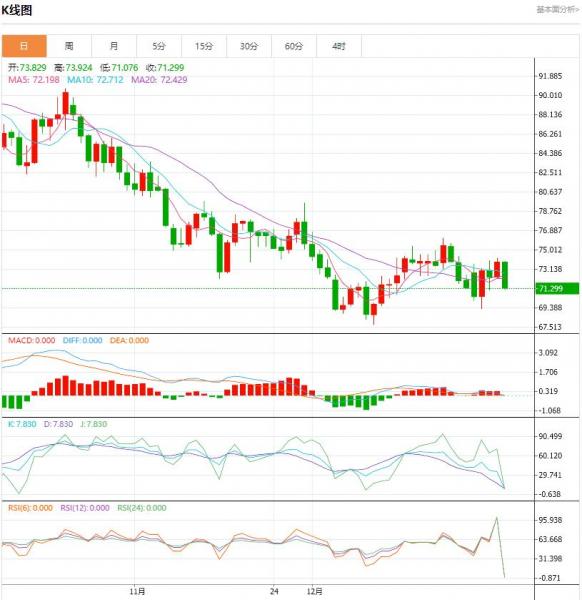 国际油价周一(1月8日)震荡走弱,美原油一度下跌1.7%至72.58美元/桶,回吐了上周五的大部分涨幅。上周数据显示,美国国内馏分油和汽油库存"大幅"增加,暗示成品油需求疲弱,可能是由于今冬气温远高于正常周期。