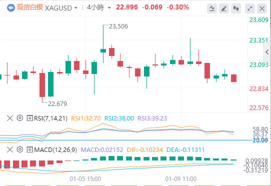 从图中白银4小时周期图看,从波浪角度来看,白银这一轮从24.60一线开启新的下行五浪走势,从延展力度来看,形成了有效的下行推动,当前处于ABC调整浪中的B转C阶段,可借助技术性调整后继续做空。从下方MACD指标来看,量能前期出现空头放量,当前处于修正。所以,操作上建议逢高尝试做空思路为主。