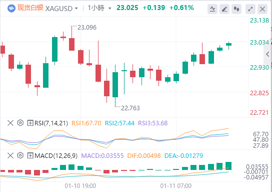 从图中黄金1小时周期图来看,近期黄金处于下跌趋势中,当前价格维持在低位震荡整理,从结构看,黄金在下跌过程中,高点逐渐降低,低点出现走平,行情出现企稳,但未能改变下跌结构,预示下跌动能有减弱迹象,日内可继续以顺势高空为主,但需要注意反弹力度。从MACD指标来看,双线整体维持在零轴附近运行,并且有金叉往上迹象,表明可能会有反弹,需要注意反弹力度。操作上建议逢高尝试做空思路为主。