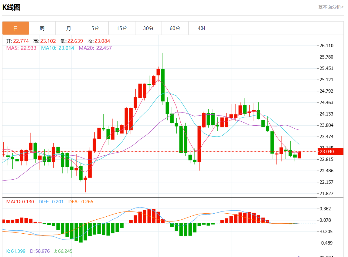 周四欧市盘中,现货白银报23.005,涨幅0.56%。