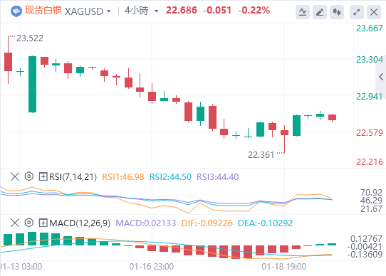 从白银4小时周期图看,白银从前期高点24.47开始滞涨下跌以来,一路受均线压制高低点同步下移,直到打到23.51-22.46附近的箱体结构,当前价格最低报22.41附近,已经下破箱体下沿,行情结构上空头趋势还在延续,均线系统MA20和MA60在上方形成压制作用,顺势指标CCI在超买区间附近走缓,显示反弹力度有所减弱,价格随时可能继续下行,若日内反弹至22.86附近,当以布局空单为主。