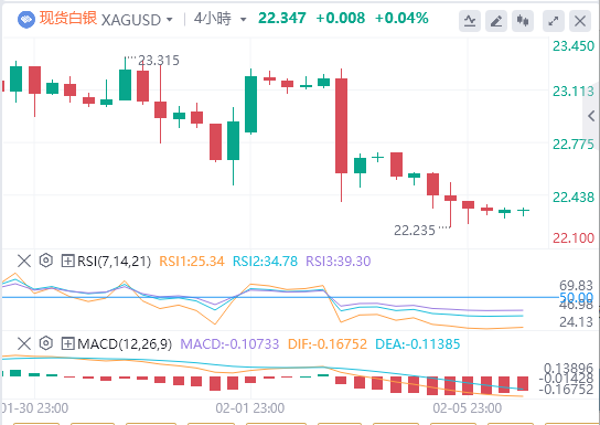 从上图的白银1H周期图来看,白银于此前进行下跌,走出高低点逐渐下移的下跌形态,并构建下行趋势线,行情沿趋势线进行下跌。昨日,白银再次向下测试趋势线支撑后迎来反弹。从指标上来看,目前MACD指标的DIFF与DEA双线依旧运行于0轴下方,且行情反弹乏力,预计行情后市大概率将迎来延续的下跌。日内操作建议以逢高做空为主,可于上方关键压力22.50一线进行入场。