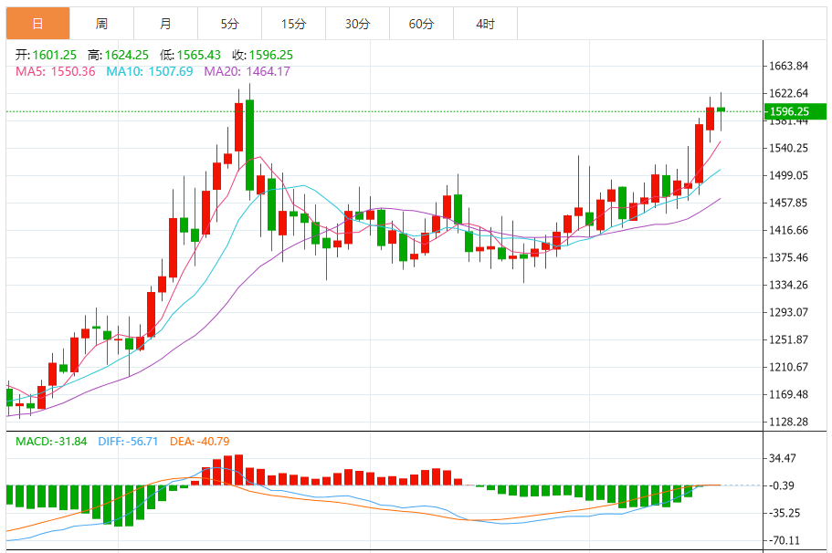 从白银1小时周期图看,价格自25.97一线获得买盘的支撑,多头不断创出新高,近期最高涨至32.53一线,受到获利回吐盘的打压,价格虽有回落,但不破前期起涨点,市场仍然处于多头趋势中。均线系统上,价格大阳线上涨,上穿短期60均线及长期100均线,表明银价进入偏多走势中。操作上尝试逢低做多,建议投资者于31.28一线尝试布局多单,上行关注32.16一线的压力,若上破银价将进一步上涨,多头将测试前期高点32.53一线。