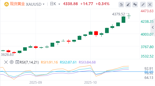 美国政府继续停摆、国际贸易局势紧张也在持续吸引避险买盘支撑金价,各国央行购金以及去美元化趋势等多重因素也持续给金价提供上涨动能。美联储的货币政策动向一直是黄金价格的重要风向标。在当前经济环境下,市场对美联储降息的押注如火如荼,推动金价屡创新高。根据芝加哥商品交易所的“美联储观察”工具,投资者几乎笃定美联储将在10月会议上降息25个基点,概率高达96.3%,而12月至少再降息25个基点的概率更是升至99.6%,其中12月再降息50个基点的概率升至14.6%。这一预期源于美国就业市场的喜忧参半信号:虽然GDP数据仍显强劲,但劳动力需求相对于供给的减弱,以及移民减少和参与率下滑,都让美联储官员们警铃大作。