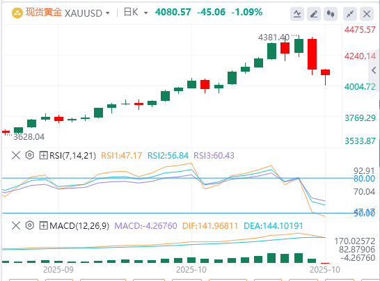 技术面与资金面双重施压:COMEX黄金期货净多头持仓连续三周下降,印度季节性购金潮结束加剧实物需求疲软。技术面上,金价跌破4100美元关键支撑位,触发程序化交易止损盘,形成“下跌-抛售”的负反馈循环。