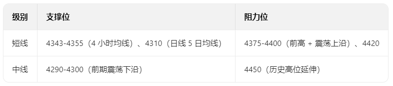 4小时:高位横盘,均线密集支撑4343-4355,若回踩企稳则完成阻力-支撑转换;跌破则测试4310-4300区间。