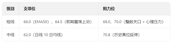形态:突破66.9关键阻力后延续强势,但连续新高后缺乏换手,回调压力累积。
