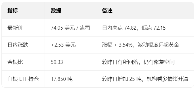 白银:波动剧烈,当前74.00美元/盎司附近(日内涨幅约3.5%),弹性远超黄金,关注75.00强阻力与71.00-72.00关键支撑,建议区间操作,严格止损。