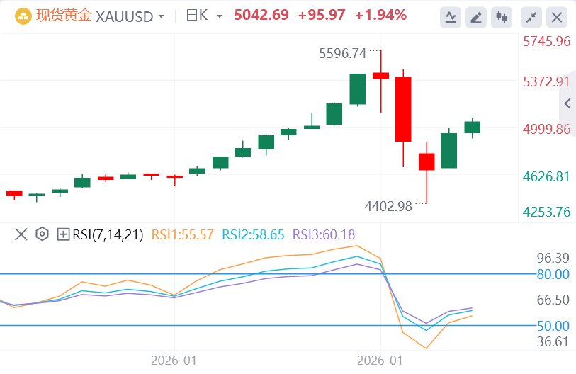 金价强劲反弹,创2008年11月以来最大单日涨幅,基本面坚挺之际,低吸买盘者纷纷入场。现货金收涨6%,至每盎司4938.5美元。