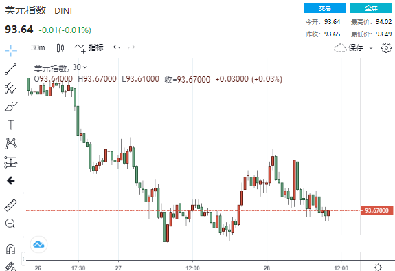 美元指数一度反弹至94.02,现回落至93.64附近交投。周一美元跌至93.47,为2018年6月以来的最低水平。