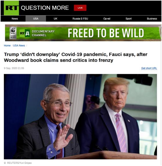今日俄罗斯电视台:在伍德沃德新书爆料让(特朗普的)批评者狂怒后,福奇表示特朗普“没有淡化”新冠疫情