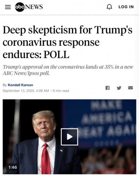美国广播公司和益普索进行的最新调查显示,美国民众对特朗普应对新冠疫情的方式普遍不满,他在这方面的支持率仅为35%,不认同的比例高达65%。