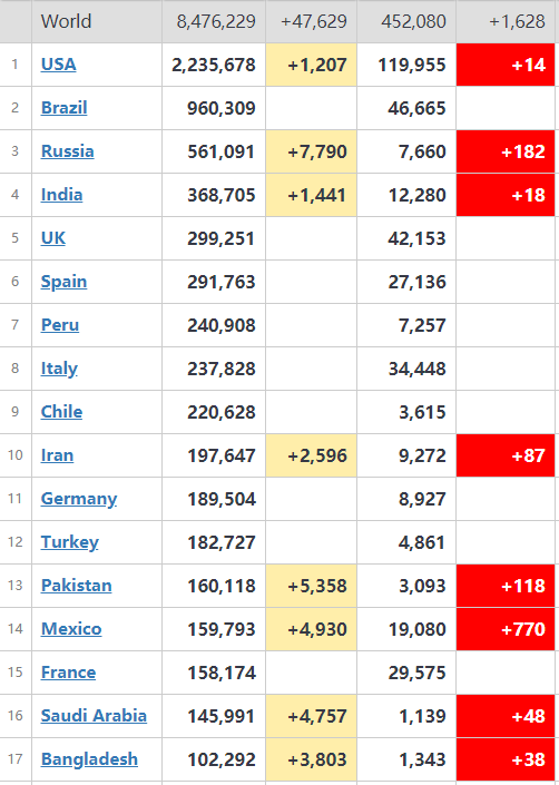 worldometers的统计数据显示,全球新冠肺炎确诊病例突破10万的国家达到17个,分别为美国、巴西、俄罗斯、西班牙、英国、印度、意大利、秘鲁、德国、伊朗、土耳其、法国、智利、墨西哥、沙特、巴基斯坦、孟加拉国。加拿大的确诊病例也将超过10万。死亡病例超过1万例国家达到7个,分别为美国、巴西、西班牙、英国、意大利、法国、墨西哥。