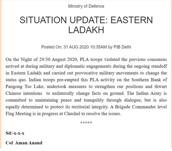 声明称,印度军队先发制人,在班公湖(Pangong Tso)南岸采取措施加强了印度的阵地,挫败中国单方面改变地面事实的意图。声明指出,印度军队致力于通过对话维护和平与安宁,但也同样决心保护其领土完整。