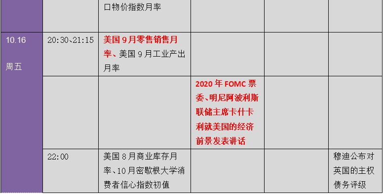 下周,全球市场将迎来美国CPI、零售销售等重磅经济数据、英国脱欧的“终极谈判”,以及原油市场的两份报告,此外OPEC+联合技术委员会(JTC)还计划在下周四举行会议。除了经济数据之外,关于英国脱欧协议,下周势必将有重大消息!10月15日是英国首相约翰逊此前提出的达成脱欧协议的最后期限,同时10月15-16日将举行欧盟峰会。泰晤士报最新消息,若下周的谈判失败,英国与欧盟同意寻求达成“迷你版协议”。美股方面,周三苹果公司举办新品发布会,多数分析师认为,该发布会将用于发布具备5G功能的新iPhone 12。此外,中美局势、中印边境冲突、台海局势等仍然可以成为市场的焦点。