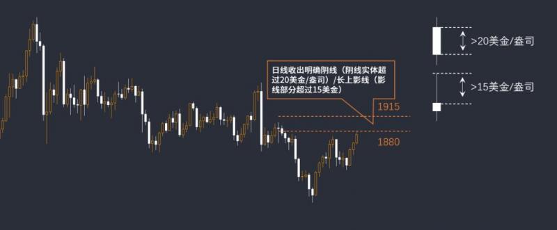 可能给出大于1个月的做空窗口。价格可能会因为利好兑现而短线走高,但也给出更好的进场位置。进场条件同样为日线收出明确阴线(阴线实体超过20美金/盎司)/长上影线(影线部分超过15美金)。