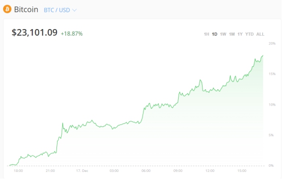 在黄金大涨之际,比特币的狂飙似乎更为引人关注:周四,比特币突破23000美元关口,继续创下历史新高,日内暴涨逾1600美元,今年累计涨幅超过200%。