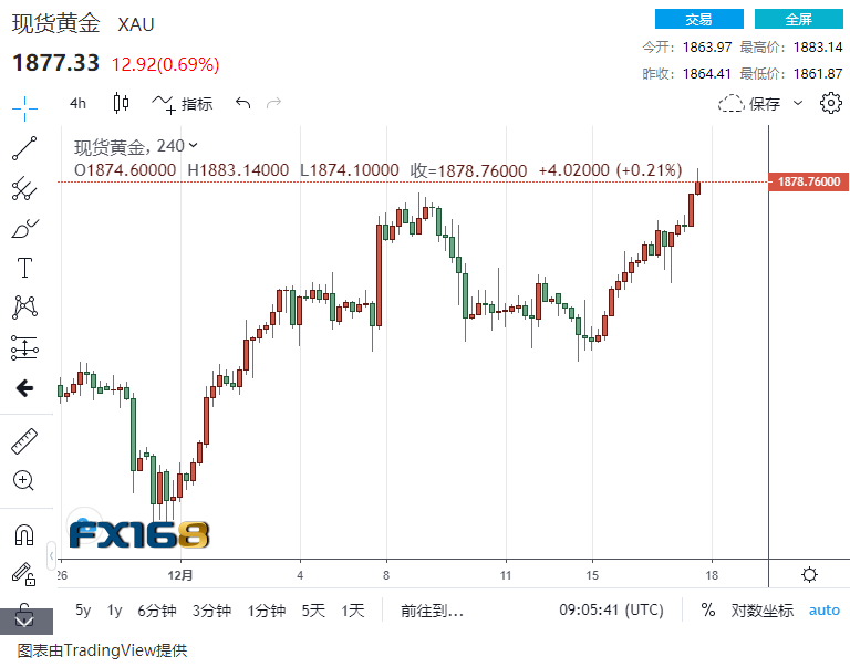 周四(12月17日)欧市早盘,现货黄金持续大涨,连续冲破1870、1880关口,最高升至1883.14美元/盎司,录得11月18日以来新高。现货白银同样上攻,最高25.789美元/盎司,刷新11月9日以来高位。