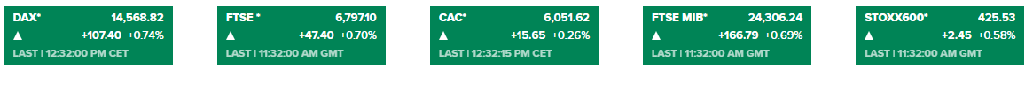 欧美股市:欧洲股市周二开盘走高,盘中延续涨势,截至发稿,欧洲斯托克600指数、英国富时100指数、法国CAC40指数、德国DAX30指数、意大利富时MIB指数涨势分别如下图所示:
