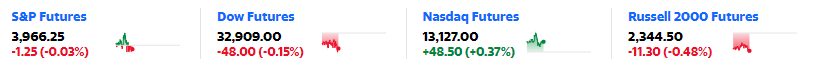 美国股指期货涨跌互现,截至发稿美国三大股指期货走势分别如下图所示: