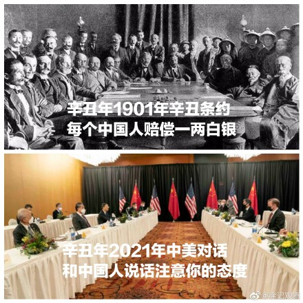 同是辛丑年,世界没变,只是中国变了,和中国说话注意你的态度!谈不拢很正常,美国已经习惯了居高临下的跟他国谈判。 至于我方的意思也很简单,之前你们好歹装装样子,现在连装都不装了,直接上来就找事。 以前我们实力不行的时候,也许忍忍就过去了。 但现在明显不是以前了。