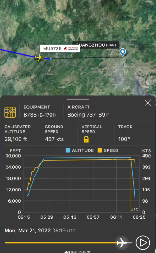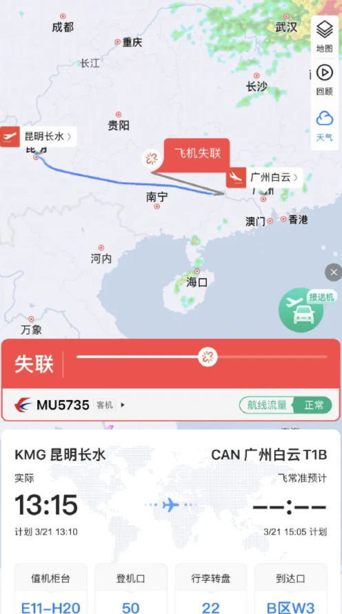 3月21日下午4点左右,梧州市消防支队119接警平台一名工作人员表示,已经接到有飞机“失事”的报警,目前消防人员正在赶往现场处置。此外,广州白云机场一名工作人员表示,MU5735航班从昆明长水到广州白云机场,系统预计在14:55分到达,但目前系统显示该航班暂未到达。通过白云机场官方小程序查询航班动态发现,MU5735原计划于3月21日13时10分在昆明长水起飞,14时52分到达广州白云国际机场,目前失联状态。