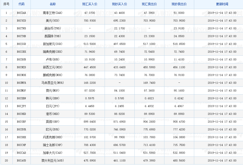 今日中国银行外汇牌价表 如霜 2019-11-14 17:58 436
