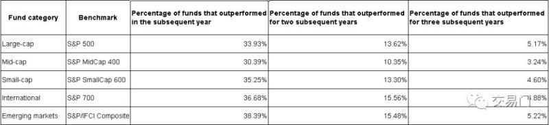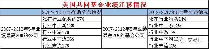 不过厉害的基金经理终究是活生生的存在,对吗?那我们就投资这些厉害的基金经理不就成了么?道理是这样,很多投资人也是这么做的。不过找到这些厉害的基金经理,追进去后情况如何呢?ICI(美国基金业者联合组织协会)整理了2007-2017年美国共同基金业绩迁移情况: