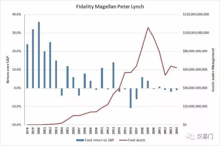 另一个陷阱是投资者往往迷恋基金规模,倾向于选择规模大的基金。这种从众行为跟追涨杀跌没有太大区别。我们看看麦哲伦基金的收益率和规模的演进: