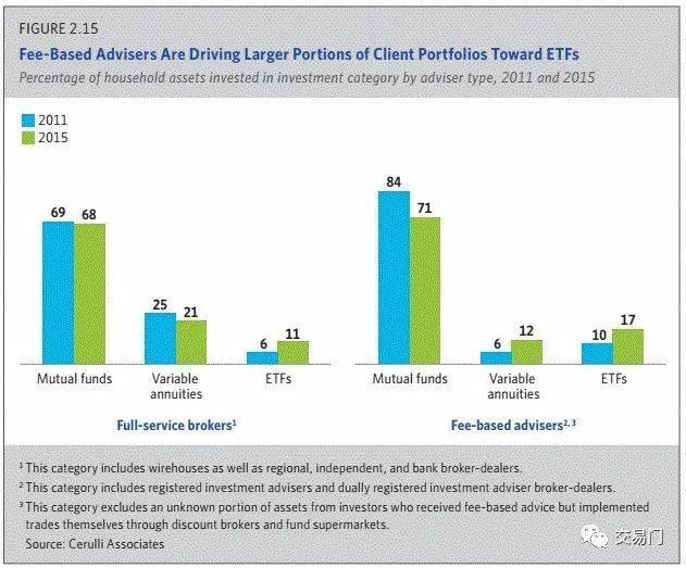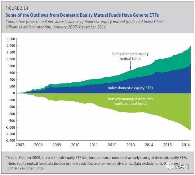 2007年到2016年,美国股票指数基金和指数ETF基金净流入和红利再投资达1.4万亿美元,同时股票类主动管理基金净流出1.2万亿美元。基于股票指数的ETF基金增长尤为突出,自2007年来吸引的资金是纯指数基金的1.5倍。居民2016年在ETF基金上的投资份额比上一年增长一倍之多。