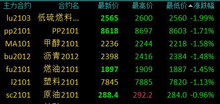 11月27日讯 国内期货市场开盘,商品期货多数上涨,沪镍、螺纹、热卷涨逾1%。低硫燃料油跌近2%,PP、甲醇、沥青等跌超1%。