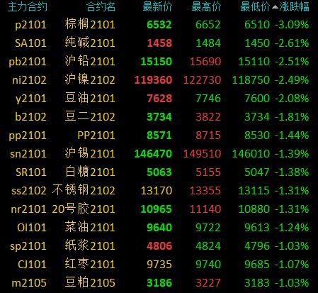 12月1日讯 国内期货市场开盘,商品期货多数下跌,纯碱跌超3%,沪镍、棕榈跌超2%,沪铅、PP、豆油跌超1%。郑煤涨超2%,沪铝、焦煤涨超1%。