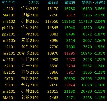 国内商品期货收盘:多数收跌,有色金属跌幅居前、沪铝跌近4%
