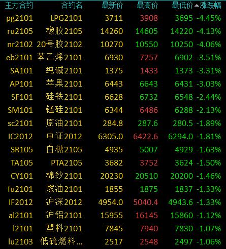 12月9日讯 国内期货市场收盘,商品期货多数下跌,煤炭板块强势上涨,焦煤涨近6%,动力煤涨停,涨幅4.00%,PVC涨超3%,玻璃、尿素涨超2%。焦炭、螺纹、热卷、纸浆涨超1%。LPG、橡胶、NR跌超4%,EB、纯碱、苹果跌超3%,硅铁跌超2%,原油、白糖、燃油跌超1%。